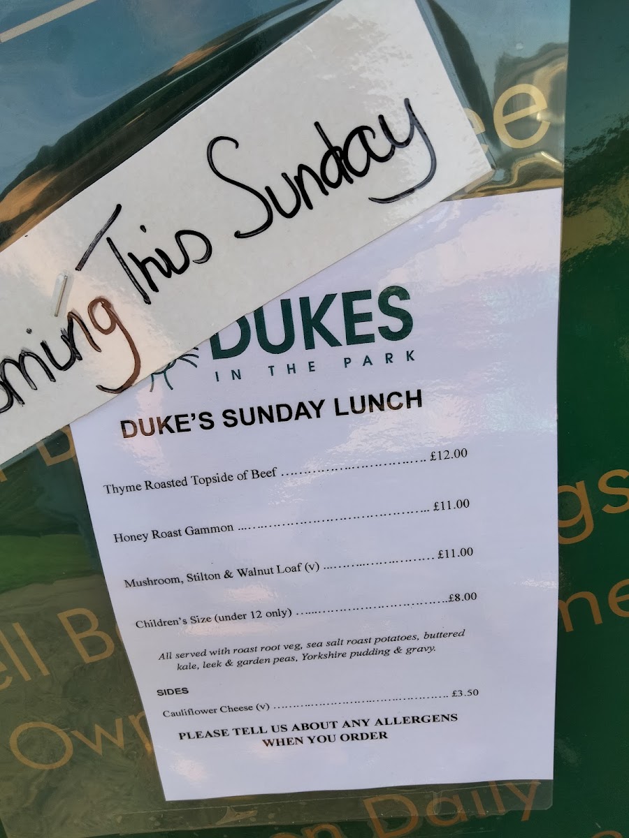 The menu highlights include a sumptuous Duke's Sunday Lunch, featuring Thyme Roasted Topside of Beef and Honey Roast Gammon, both available at reasonable prices. For lighter fare, enjoy cold sandwiches such as Yorkshire Ham or Cheese. Hot options include tempting dishes like Cod Fish Fingers, Chicken Breast Chunks, and a variety of savory pastries.